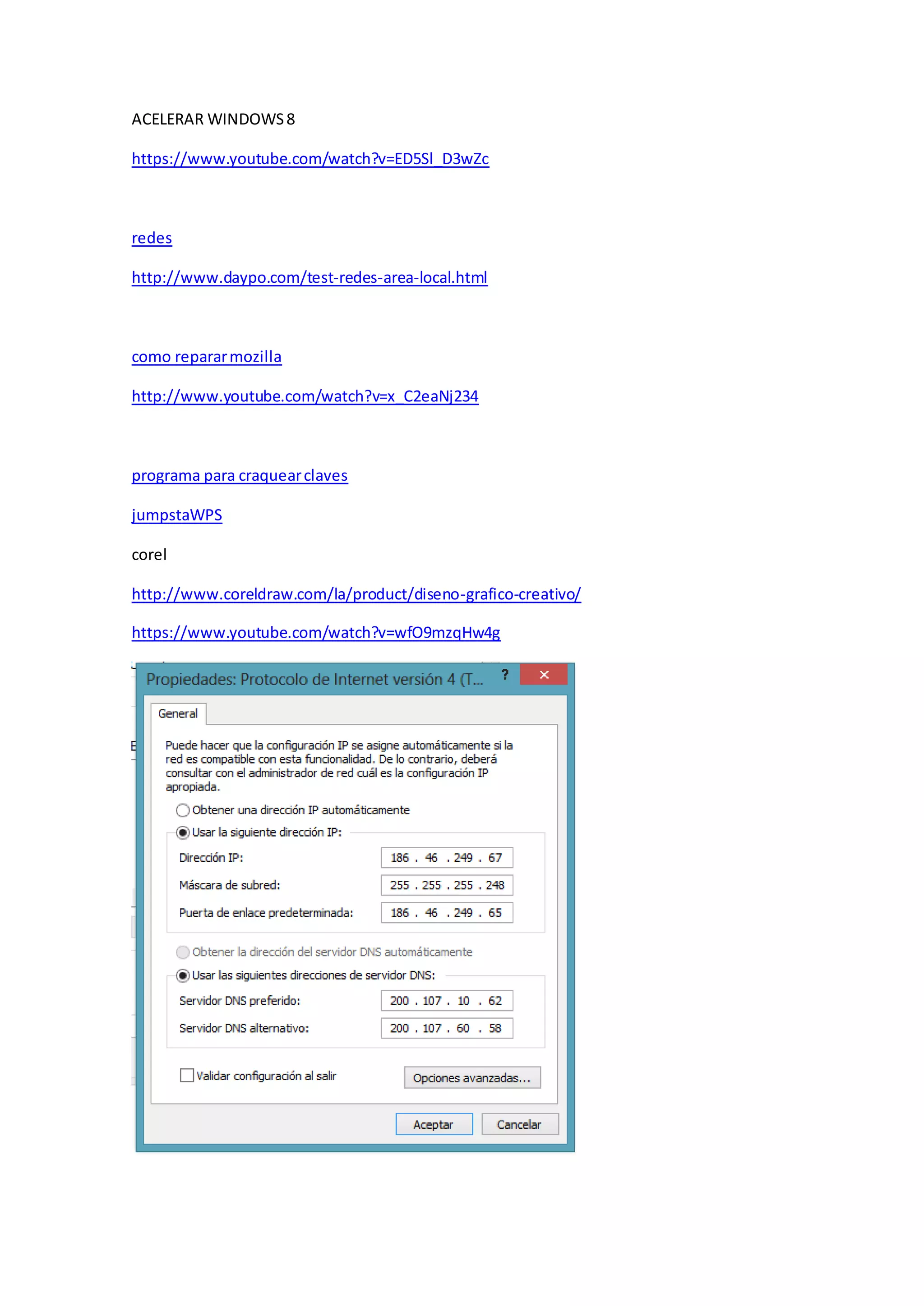 Este documento contiene varios enlaces a videos y articulos sobre como acelerar Windows 8, reparar Mozilla Firefox, eliminar virus, craquear contraseñas, y acceder a distintas computadoras de manera remota. También incluye comandos de cmd como arp, chkdsk, y dxdiag para ver la direccion IP, examinar el disco duro, y diagnosticar el sistema respectivamente.