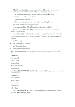 Este documento explica las reglas de tildación en español. Primero, clasifica las palabras en cuatro categorías según la sílaba tónica: agudas, graves o llanas, esdrújulas y sobresdrújulas. Luego, detalla las reglas de tildación para cada categoría y explica conceptos como acentuación diacrítica, enfática y dierética. Por último, cubre temas como concurrencia vocálica, tildación de palabras compuestas y otras excepciones a las reglas generales de acentuación.