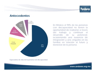 Andares es una organización en México dedicada a capacitar y guiar a personas con discapacidad hacia una vida independiente, mejorando su calidad de vida mediante programas de formación y empleo. Desde su creación, ha logrado implementar modelos residenciales, generar una escala de vida independiente y fomentar la inclusión laboral de personas con discapacidad en diferentes sectores. Además, ha establecido alianzas y ha recibido reconocimientos por sus contribuciones a la inclusión social y laboral de este grupo.