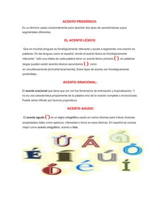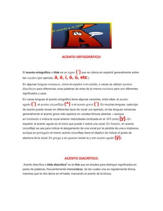 El acento ortográfico o tilde es un signo ( ́) que se coloca sobre las vocales en español y otras lenguas romances para diferenciar palabras con el mismo significado. En español, sólo el acento agudo puede ir sobre una vocal. El acento diacrítico se usa para distinguir pares de palabras monosílabas, marcando la sílaba tónica. El acento léxico es fonológicamente relevante en español e indica la sílaba acentuada en cada palabra, mientras que el acento oracional depen
