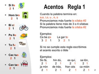 Este documento presenta información sobre las sílabas y los acentos en español. Explica que las palabras pueden tener una, dos, tres o más sílabas, y proporciona ejemplos. Luego describe dos reglas generales para saber dónde poner el acento tónico en palabras de más de una sílaba, dependiendo de si terminan en vocal o consonante. Finalmente, ofrece varios ejemplos para practicar la identificación y uso de los acentos.