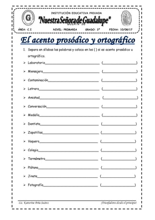 Este documento proporciona una lista de 15 palabras divididas en sílabas y clasificadas como acento prosódico u ortográfico entre paréntesis. El objetivo es ayudar a estudiantes de tercer grado a identificar el tipo de acento en palabras divididas silábicamente como una guía educativa.