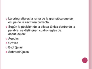 Este documento explica las cuatro reglas de acentuación en español: agudas, graves, esdrújulas y sobresdrújulas. Define cada una y proporciona ejemplos. También discute las palabras monosílabas y el acento diacrítico, destacando las diferencias entre palabras similares como "de" y "dé".