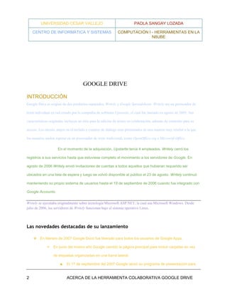 Google Drive es una herramienta colaborativa en la nube que permite editar documentos de forma simultánea y sincronizar archivos entre dispositivos. Sus principales novedades al lanzarse incluyeron ampliar el almacenamiento gratuito de 1GB a 15GB, permitir editar y eliminar archivos sin conexión a internet, y facilitar la colaboración en documentos entre varios usuarios de forma simultánea.