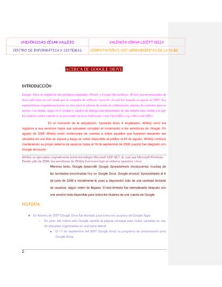 Google Drive es una herramienta de almacenamiento y sincronización en la nube desarrollada por Google. Nació de la fusión de Google Docs y Google Spreadsheets, y actualmente permite crear y editar documentos, hojas de cálculo y presentaciones en la nube de forma colaborativa. Entre sus principales características se encuentran el almacenamiento gratuito de 15GB, la edición y visualización sin conexión, y la sincronización automática de archivos entre dispositivos.