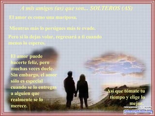 Este documento ofrece consejos sobre el amor dirigidos a diferentes tipos de amigos, incluyendo solteros, casados, comprometidos, con el corazón roto, posesivos, tímidos para confesar sus sentimientos y aquellos que siguen esperando. El mensaje principal es que el amor conlleva dolor pero también enseñanzas, y que la compatibilidad en una relación depende de lo bien que se llevan ambas personas más que de los años juntos.