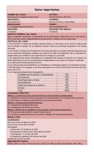 Este documento presenta la información sobre un curso de 9 semanas sobre Participación y Ciudadanía Democrática. El curso se llevará a cabo de forma semi-presencial con 4 sesiones por semana. El objetivo general es que los estudiantes reconozcan la importancia de la participación democrática y ejerzan sus derechos y obligaciones de forma responsable. El curso consta de 4 módulos temáticos, incluyendo la democracia histórica, la organización del estado mexicano y la relación entre ciudadanía y autoridad. Se