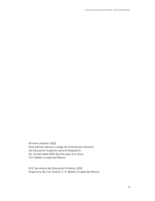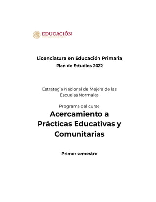 Este documento presenta el plan de estudios 2022 para la Licenciatura en Educación Primaria. Incluye información sobre el curso "Acercamiento a Prácticas Educativas y Comunitarias" que se enfoca en iniciar a los estudiantes en el análisis de prácticas educativas comunitarias y el desarrollo de habilidades de observación y entrevista. El curso consta de dos unidades: la primera examina cómo las comunidades constituyen a los sujetos a través de prácticas, saberes y creencias; la segunda