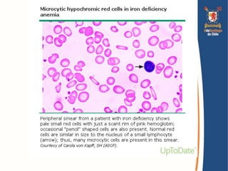 El documento presenta una introducción al acercamiento diagnóstico del paciente con anemia. Explica la definición de anemia y los criterios de la OMS. Describe la función de los glóbulos rojos, la eritropoyesis, los mecanismos de adaptación y las manifestaciones clínicas de la anemia. Además, introduce las clasificaciones morfológica y fisiopatológica de las anemias y los enfoques para la evaluación y diagnóstico diferencial del paciente con anemia.