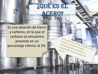 El documento describe el acero, una aleación de hierro y carbono con menos del 2% de carbono. Explica que el acero puede clasificarse según su contenido de carbono y enumera algunos usos comunes. También resume brevemente la historia de la fabricación del acero y los principales avances en los procesos de producción industrial.