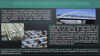 El documento describe los orígenes y usos del acero en la construcción. Explica que el acero es uno de los materiales más versátiles debido a su resistencia y capacidad de ser moldeado. Se ha usado históricamente en puentes, edificios altos y estructuras. También detalla los diferentes tipos de acero y perfiles metálicos utilizados comúnmente en la construcción.