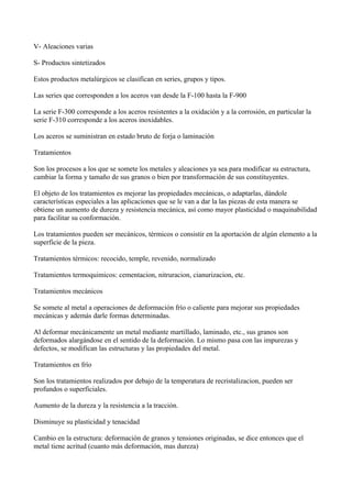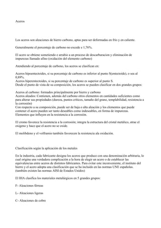 Los aceros son aleaciones de hierro y carbono que se clasifican según su contenido de carbono en hipoentectoides e hiperentectoides. También se clasifican en aceros al carbono y aleados, siendo estos últimos aquellos que contienen otros elementos como cromo, níquel o molibdeno. Los aceros inoxidables son resistentes a la corrosión y contienen al menos un 12% de cromo, clasificándose en ferriticos, martensiticos u austeniticos según su estructura.