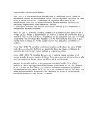 Este documento proporciona información sobre acero y tratamientos térmicos. Explica que el acero es una aleación de hierro y carbono con menos del 2.1% de carbono y describe los diferentes estados del hierro a diferentes temperaturas. También resume los principales tratamientos térmicos como el temple, revenido y recocido y sus efectos en las propiedades del acero. Finalmente, cubre conceptos clave como hornos para tratamientos térmicos y diagramas de fases hierro-carbono.