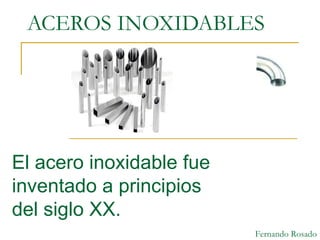 Este documento describe los diferentes tipos de aceros inoxidables, incluyendo sus propiedades y usos. Explica que el acero inoxidable es una aleación de hierro con pequeñas cantidades de carbono y otros elementos como cromo y níquel. Se clasifican los aceros inoxidables en ferríticos, martensíticos, austeníticos y dúplex, dependiendo de su composición y estructura metalúrgica. Finalmente, menciona algunas aplicaciones comunes del acero inoxidable en la industria y el hogar.