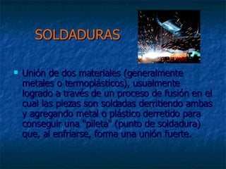 El documento habla sobre diferentes tipos de soldaduras. Explica que la soldadura une dos materiales, generalmente metales, derritiéndolos y añadiendo más material derretido para crear una unión. Luego describe los diferentes procesos de soldadura como arco eléctrico, láser, electrones o ultrasonido. También menciona que los gases como el acetileno y el oxígeno son comúnmente usados, especialmente el acetileno debido a su capacidad inflamable. Finalmente, resalta algunas ventajas de usar gases como el