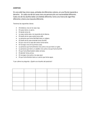 El acertijo describe 5 casas de colores diferentes en una fila, cada una con un dueño de una nacionalidad distinta que bebe una bebida, fuma una marca de cigarrillos y tiene una mascota diferentes. Se proporcionan pistas sobre los detalles de cada casa y sus residentes. La pregunta final es ¿quién es el dueño del pececito?