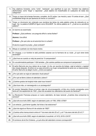Este documento contiene 98 preguntas breves de lógica, acertijos y razonamiento. Las preguntas exploran una variedad de temas como calendarios, matemáticas, refranes populares y situaciones hipotéticas.