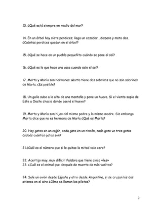 Este documento contiene 70 acertijos o adivinanzas breves, cada una numerada del 01 al 70. Los acertijos presentan preguntas sobre temas variados como animales, números, palabras y sus significados con el objetivo de adivinar u obtener la respuesta correcta de forma ingeniosa.