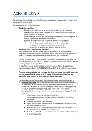 El documento describe varias barreras que pueden limitar el acceso a sitios web para personas con discapacidades o limitaciones, incluyendo obstáculos cognitivos, físicos, tecnológicos y contextuales. Entre las barreras cognitivas se encuentran el uso de un lenguaje complejo, falta de organización y ausencia de gráficos. Las barreras físicas incluyen deficiencias visuales, auditivas y motrices. Las barreras tecnológicas son hardware y software anticuados, y conexiones lentas. Las barreras contextuales son equipos