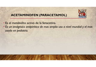 El acetaminofén es un analgésico y antipirético ampliamente usado que actúa inhibiendo la síntesis de prostaglandinas. Se absorbe rápidamente por vía oral y se metaboliza en el hígado. Puede causar hepatotoxicidad en dosis altas, por lo que se requiere tratamiento temprano con N-acetilcisteína en caso de sobredosis para prevenir daño hepático.