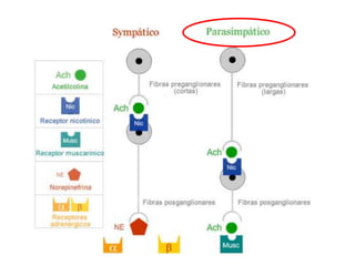 El documento aborda la acetilcolina, su síntesis y degradación, así como su función en diversos sistemas del cuerpo humano, incluyendo el cardiovascular y gastrointestinal. También se mencionan los efectos de la acetilcolina, como vasodilatación y contracción muscular, así como diversas patologías relacionadas y sus tratamientos, incluyendo antagonistas y agonistas. Se destaca la importancia del calcio en la exocitosis y se citan ejemplos de intoxicaciones relacionadas con la acetilcolina.