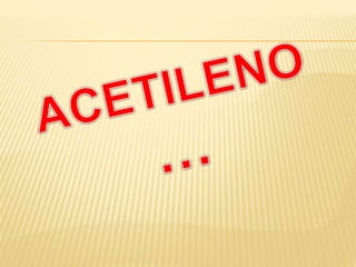 En 1836, Edmundo Davy descubrió que al agregar agua al carburo de potasio se produce una violenta reacción química que genera un gas incoloro llamado acetileno. El documento luego describe los usos del acetileno, que incluyen carburación en equipos automotrices y soldadura, y explica el proceso de producción del acetileno a partir del carburo de calcio y el agua.