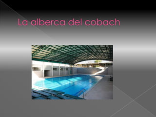 El documento habla sobre la alberca semiolimpica del cobach, la cual tiene temperatura regulada, salvavidas y coordina Francisco Javier Ramires Gonzales. Mide 12x13.5 metros con cinco carriles y profundidad de 18 metros, además de vestidores, regaderas y gradas. Se informa que a partir del 17 de agosto habrá dos horarios de práctica en la alberca: turno vespertino de 11-12 hrs y turno matutino de 12-15 hrs, requiriendo traje de baño y demás equipo.