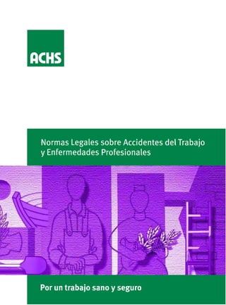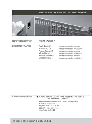 Este documento es un manual que recopila las normas legales sobre accidentes del trabajo y enfermedades profesionales en Chile. Incluye leyes, decretos leyes, decretos con fuerza de ley y decretos supremos relacionados con este tema. El manual contiene índices para facilitar la búsqueda de normas por categoría, orden numérico y fecha. El objetivo es que empleadores, trabajadores y otros actores conozcan la legislación chilena sobre riesgos laborales.