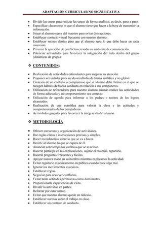 Este documento presenta una adaptación curricular no significativa para un estudiante de 6o grado diagnosticado con TDAH. El objetivo es mejorar su atención, comportamiento y habilidades sociales a través de estrategias como actividades estimulantes, instrucciones claras, reforzadores positivos, y trabajo en pequeños grupos. La evaluación se realizará de forma continua mediante una rúbrica que mide el progreso en áreas como la atención, autocontrol, pensamiento analítico y respeto hacia los demás.