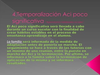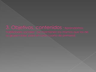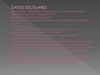 Este documento describe los posibles síntomas de un niño con trastorno por déficit de atención e hiperactividad (TDAH), incluyendo dificultades para prestar atención, seguir instrucciones de amigos, esfuerzo inconsistente en tareas, y conocimiento de que se desempeña mejor cuando se esfuerza. También enumera recursos como Google, cuentos interactivos y materiales impresos que podrían usarse para mejorar las habilidades sociales del niño.