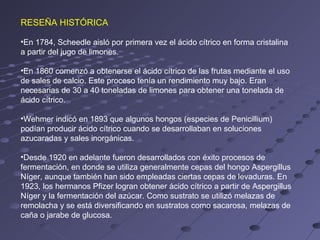 El documento resume la historia y proceso de obtención de ácido cítrico. Originalmente se extraía de cítricos como limones, pero ahora se produce principalmente por fermentación usando Aspergillus niger y melaza de caña de azúcar como materia prima. El proceso incluye fermentación, purificación con cal y ácido sulfúrico, cristalización, secado y empaque. El ácido cítrico se usa ampliamente en alimentos, bebidas y otros productos.