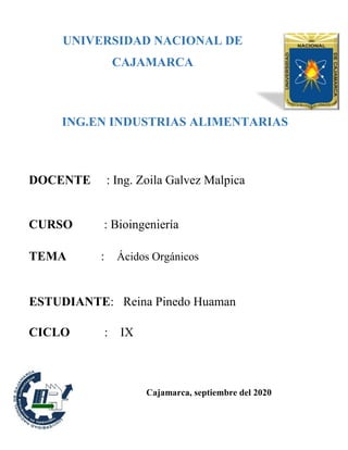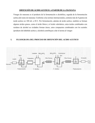 Este documento describe el proceso de obtención de ácido acético a partir de la manzana mediante fermentación. Explica el flujograma del proceso que incluye etapas como recepción, lavado, pelado, fermentación alcohólica, fermentación acética, clarificación, filtración, pasteurización y envasado. También describe factores como concentración de alcohol, temperatura, pH y aireación que afectan la fermentación acética realizada por la bacteria Acetobacter en un biorreactor. Finalmente, conclu