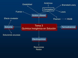El documento trata sobre la teoría de los ácidos y bases según diferentes conceptos como Arrhenius, Brønsted-Lowry y Lewis. Explica que según Arrhenius los ácidos liberan iones hidrógeno y las bases liberan iones hidroxilo. Según Brønsted-Lowry los ácidos son donadores de protones y las bases son aceptoras de protones. Y según Lewis los ácidos aceptan pares de electrones y las bases donan pares de electrones para formar enlaces coordinados.