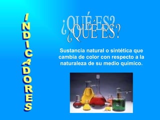 Los indicadores químicos son sustancias que cambian de color dependiendo del pH de su medio, lo que permite determinar si un medio es ácido, neutro o básico. Las antocianinas, pigmentos naturales presentes en plantas, son un tipo de indicador químico cuya coloración depende del pH, siendo roja en medio ácido y púrpura o azul en medio básico. Los indicadores químicos se utilizan para determinar el grado de acidez o pH de una sustancia o para monitorear el progreso