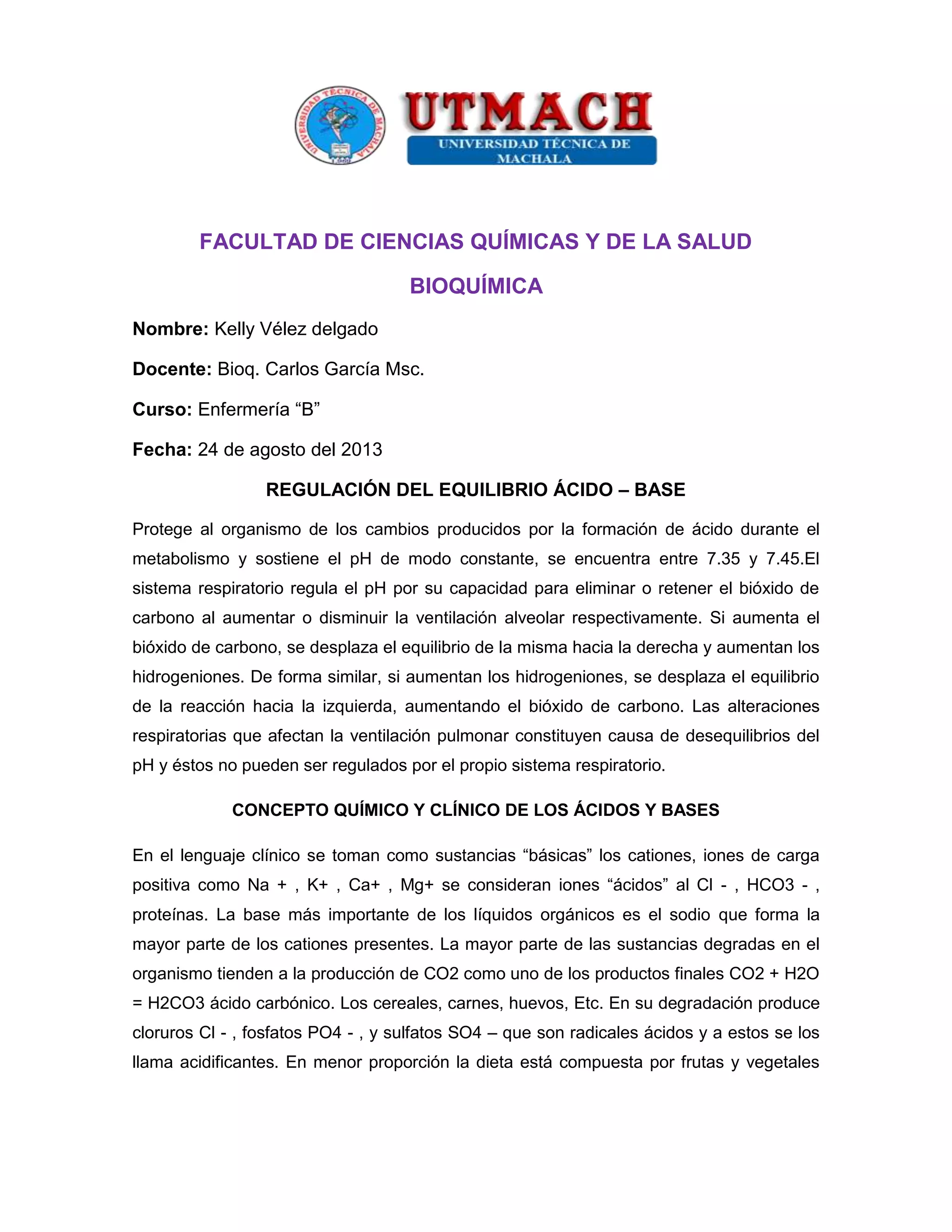 Este documento resume los mecanismos de regulación del equilibrio ácido-base en el organismo. Explica que el sistema respiratorio regula el pH al eliminar o retener dióxido de carbono, y que los riñones son los reguladores más eficientes al permitir la eliminación de ácidos a través de la orina. También describe los sistemas amortiguadores en los líquidos orgánicos, como el equilibrio entre ácido carbónico e ion bicarbonato, y los intercambios iónicos y mecanismos respiratorios y