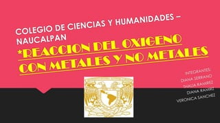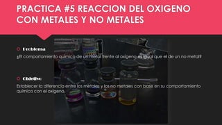 Los metales y no metales tienen diferentes comportamientos químicos frente al oxígeno. Los metales forman óxidos básicos que al reaccionar con agua producen hidróxidos básicos, mientras que los no metales forman óxidos ácidos que producen ácidos al reaccionar con agua. Las reacciones de oxidación de metales y no metales con oxígeno son exotérmicas y de combinación, formando compuestos con diferentes propiedades químicas y físicas.