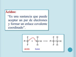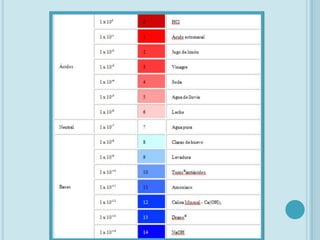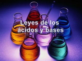El documento describe las contribuciones de varios químicos a la teoría de los ácidos y bases, incluyendo a Arrhenius, Brønsted, Lowry y Lewis. Explica las características de ácidos y bases, así como experimentos para ilustrar sus propiedades. También cubre conceptos como pH, indicadores de pH, y las teorías de Arrhenius, Brønsted-Lowry y Lewis sobre la naturaleza química de los ácidos y bases