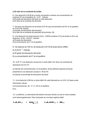 El documento proporciona 12 ejercicios de cálculo relacionados con ácidos y bases débiles. Los ejercicios involucran calcular concentraciones iónicas en equilibrio, grados de disociación, y constantes de acididad y basicidad para varias sustancias como amoníaco, ácido cloroacético y efedrina. Se pide determinar el orden de fuerza de tres ácidos, y calcular valores de Ka y Kb para diversas situaciones.