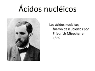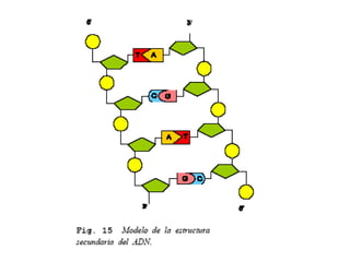 El documento describe las características fundamentales de los ácidos nucleicos ADN y ARN. El ADN contiene y transmite la información genética en forma de doble hélice, mientras que el ARN tiene diferentes funciones como mensajero, ribosomal y de transferencia en la síntesis de proteínas. Ambos polímeros están compuestos de nucleótidos formados por azúcares, bases nitrogenadas y grupos fosfato, pero se diferencian en su estructura, número de cadenas y funciones biológicas.