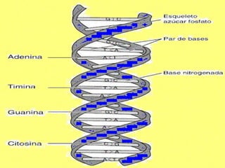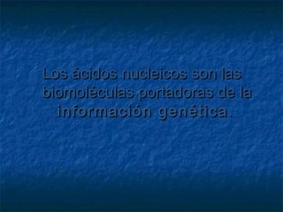 Los ácidos nucleicos ADN y ARN fueron descubiertos por Friedrich Miescher en 1869. Contienen la información genética de los organismos y cumplen funciones distintas. El ADN se encuentra en el núcleo celular y contiene las instrucciones hereditarias, mientras que el ARN participa en la síntesis de proteínas. Ambos están formados por nucleótidos compuestos de una base nitrogenada, un azúcar y un grupo fosfato.