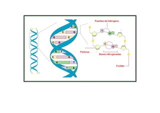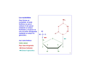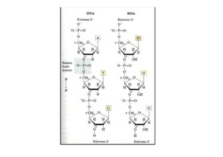 Este documento describe la estructura y composición química de los ácidos nucleicos ADN y ARN. El ADN está formado por desoxirribonucleótidos que contienen las bases A, T, G y C, mientras que el ARN contiene ribonucleótidos con las bases A, U, G y C. Ambos polímeros forman cadenas mediante enlaces fosfodiéster entre los nucleótidos. El ADN forma una doble hélice bicatenaria gracias a los puentes de hidrógeno entre las bases complementarias.