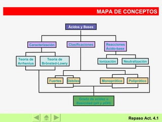 El documento presenta información sobre ácidos y bases. Explica las teorías de Arrhenius, Brönsted-Lowry y Lewis sobre ácidos y bases. También describe las características de ácidos y bases fuertes y débiles, así como reacciones como la neutralización y la ionización del agua. Incluye ejemplos de ácidos y bases comunes y donde se encuentran.