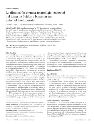 Este documento presenta la introducción de un trabajo que tiene como objetivo introducir la dimensión Ciencia-Tecnología-Sociedad (CTS) en la enseñanza de ácidos y bases en el bachillerato. Explica los fundamentos teóricos de la dimensión CTS, la enseñanza de la ciencia a través de modelos y la construcción de unidades didácticas. También discute los problemas que se han presentado en la implementación de la dimensión CTS y la importancia de abordar temas como ácidos y bases desde esta perspect