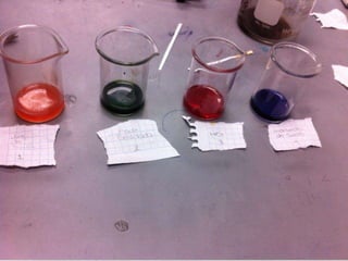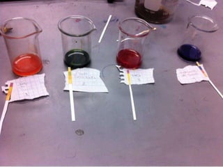 Este documento describe un experimento para determinar las propiedades de los ácidos y bases. Se colocan muestras de ácido clorhídrico, hidróxido de sodio, agua destilada y jugo de limón en vasos de precipitados y se agrega indicador universal para identificar si cada sustancia es ácida o básica mediante el cambio de color y las tiras de papel ph.