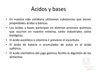 El documento aborda las propiedades de ácidos y bases en la vida cotidiana y sus aplicaciones en procesos químicos. Describe la teoría de Arrhenius, Bronsted-Lowry y Lewis sobre la ionización de ácidos y bases, así como la importancia de los indicadores y la titulación ácido-base como métodos para determinar concentraciones de soluciones. Además, se discuten ejemplos de ácidos y bases fuertes y débiles, y se explica la disociación y la ionización en soluciones.