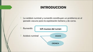 La acidosis ruminal y rumenitis afectan negativamente al ganado vacuno, presentando síntomas agudos y crónicos que incluyen desde incoordinación y diarreas hasta laminitis y disminución del apetito. La enfermedad se relaciona con dietas inadecuadas y una regulación del pH intestinal. El tratamiento incluye cambios en la alimentación y baños podales, aunque se reportan muertes en un grupo de machos afectados.