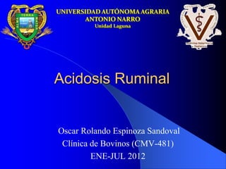 Este documento describe la acidosis ruminal aguda y subaguda en bovinos. La acidosis ruminal aguda ocurre cuando el pH ruminal cae por debajo de 5.0 y puede ser mortal, mientras que la subaguda (SARA) ocurre cuando el pH está entre 5.0-5.5 y causa problemas crónicos. La SARA se debe a raciones con altas proporciones de carbohidratos fermentables sin suficiente fibra. El diagnóstico se basa en el pH ruminal o sangre. El tratamiento incluye bicarbonato y laxantes