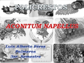 Aconitum napellus es una planta herbácea perenne con raíces carnosas y flores azules o violetas. Contiene alcaloides venenosos como el ácido acónico. Se usa en homeopatía para tratar fiebres, infecciones respiratorias y estados de ansiedad. Los síntomas que mejora incluyen miedo a morir, adormecimiento y calor en la piel.