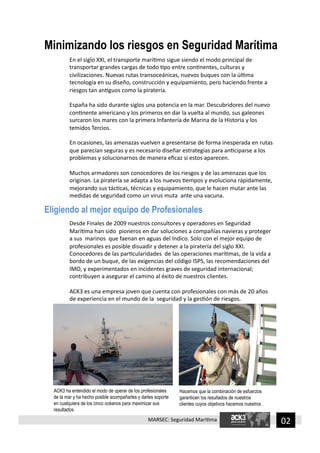 El documento habla sobre la seguridad marítima y las soluciones que ofrece la compañía ACK3 para minimizar riesgos. ACK3 proporciona servicios de consultoría, medidas de seguridad física y electrónica, y equipos de operadores de seguridad marítima altamente capacitados para proteger buques y sus tripulaciones de amenazas como la piratería. ACK3 se presenta como una empresa comprometida con una conducta responsable en la seguridad privada.