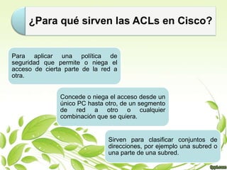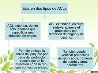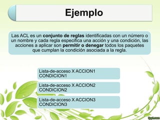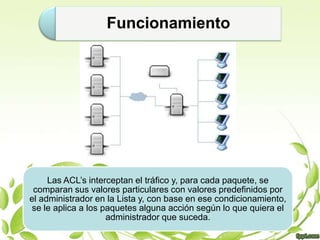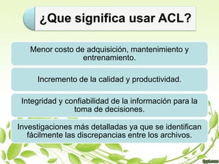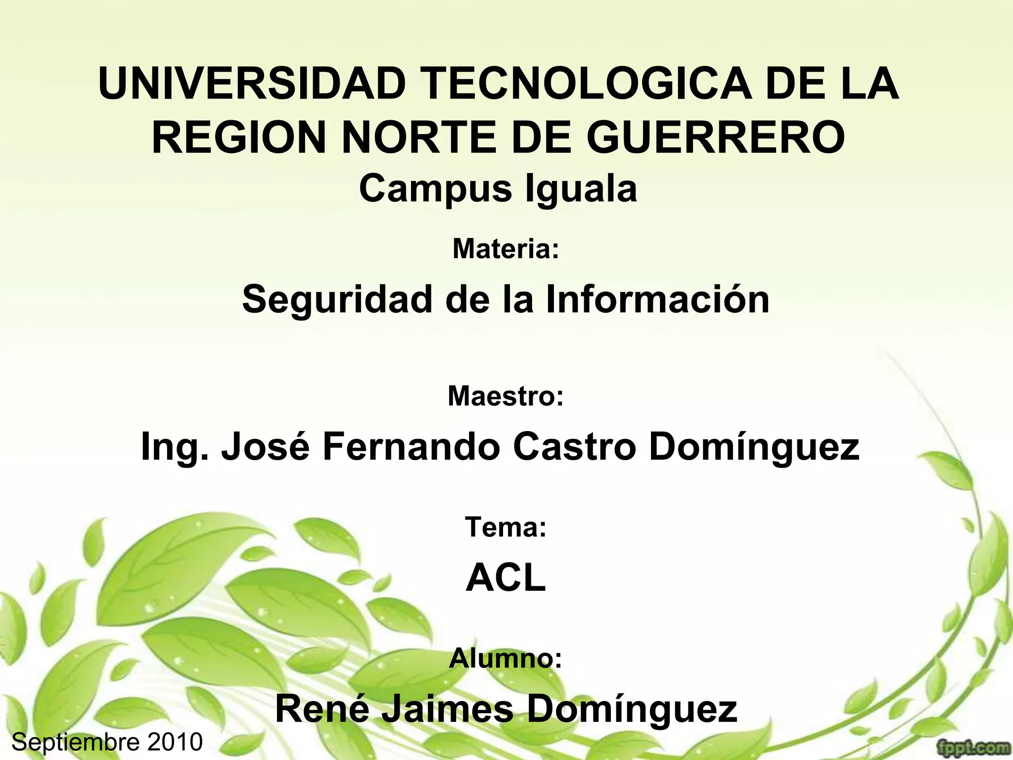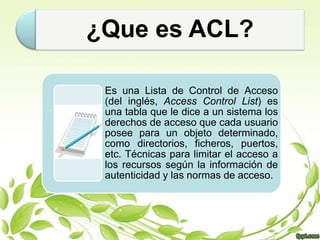 Este documento presenta información sobre las listas de control de acceso (ACL) como parte de un tema de seguridad de la información. Incluye una bibliografía de 11 fuentes en línea sobre ACL consultadas en septiembre de 2010. Fue escrito por un estudiante para una clase impartida por el Ing. José Fernando Castro Domínguez en la Universidad Tecnológica de la Región Norte de Guerrero.